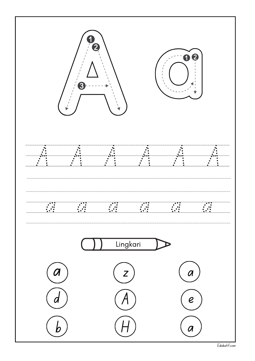 Belajar menulis alfabet dari A sampai Z merupakan langkah awal yang penting dalam proses belajar membaca dan menulis bagi anak. Dengan menggunakan lembar belajar edukatif yang dilengkapi pola serta garis titik-titik, anak dapat mengikuti bentuk huruf secara perlahan dan terarah. Metode ini membantu anak mengenal bentuk setiap huruf sekaligus melatih koordinasi antara mata dan tangan, sehingga proses belajar terasa lebih mudah dan menyenangkan.
